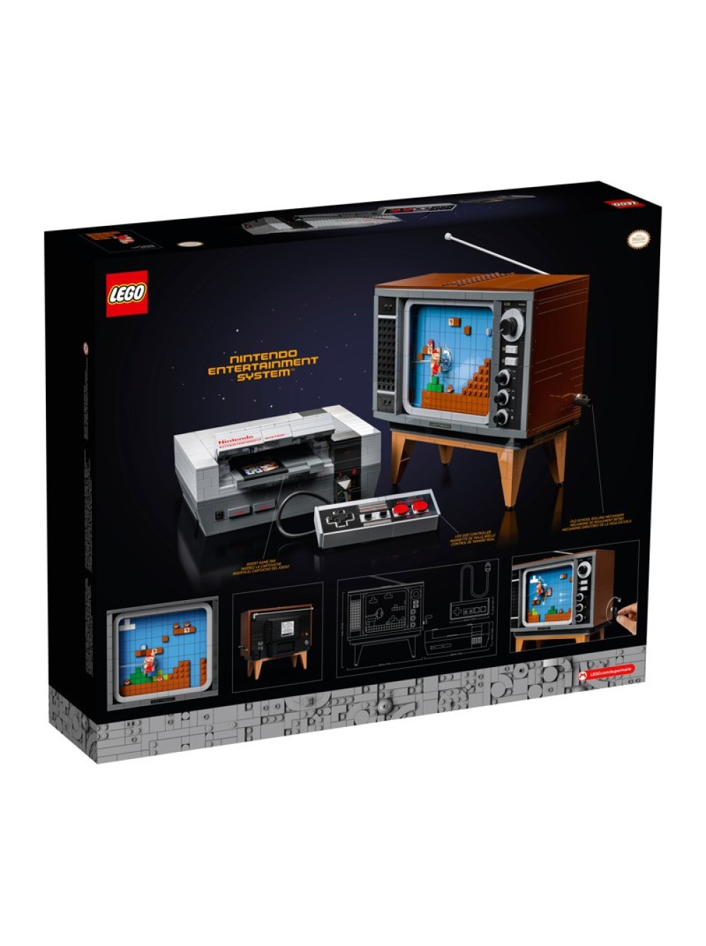Собранная из кубиков приставка NES дополнена множеством реалистичных деталей: открывающимся отсеком для игрового картриджа с функцией блокировки и джойстиком с соединительным проводом и вилкой. В комплект также входит сборная модель ретротелевизора с плоской восьмибитной фигуркой Марио на прокручивающемся экране, а также активирующий кубик, сканировав который, Марио LEGO (фигурка не входит в набор. Для того чтобы получить её, необходимо приобрести стартовый набор LEGO Super Mario) будет реагировать на врагов, препятствия и усиления, которые будет видно на экране, совсем как настоящий персонаж игры Super Mario Bros.