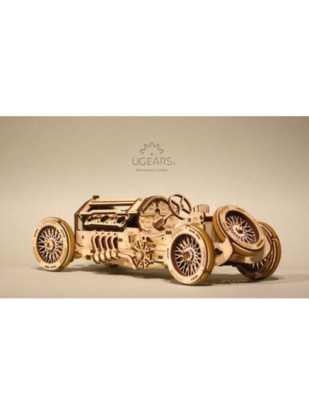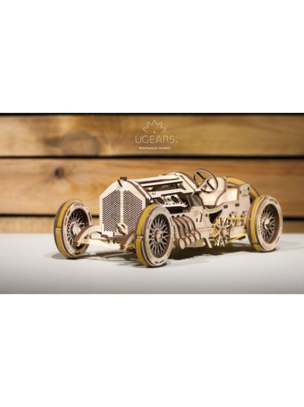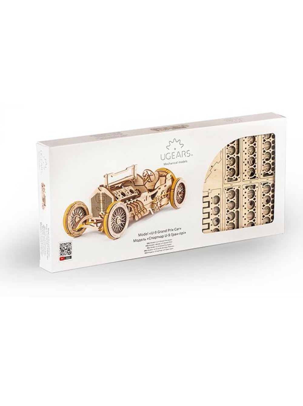 В спорткаре U-9 Гран-при UGEARS воссоздали классическую конструкцию и спортивный дизайн победителей ранних автогонок. Под капотом этого красавца Вы найдете 8-цилиндровый V-образный двигатель с 16-ю работающими клапанами и полноценным вентилятором. Гоночный автомобиль оборудован продольной рулевой рейкой и коробкой передач, переключающей режимы: «нейтральный», «назад» и «вперёд». Также в конструкции предусмотрены гоночные колёса с резиновыми покрышками, которые честно отрабатывают поверхность.
