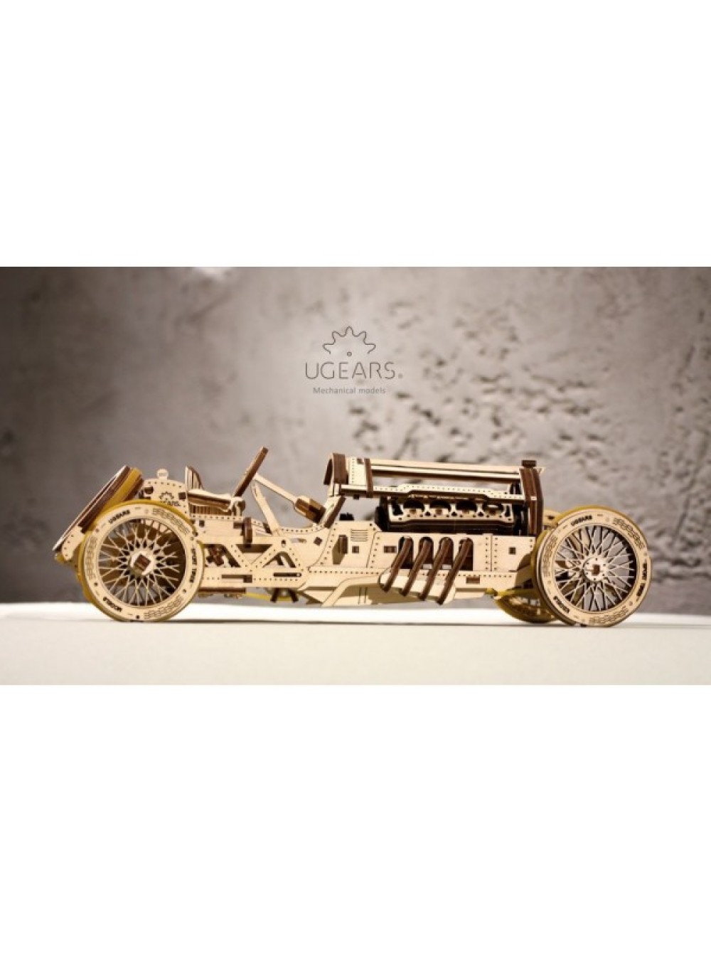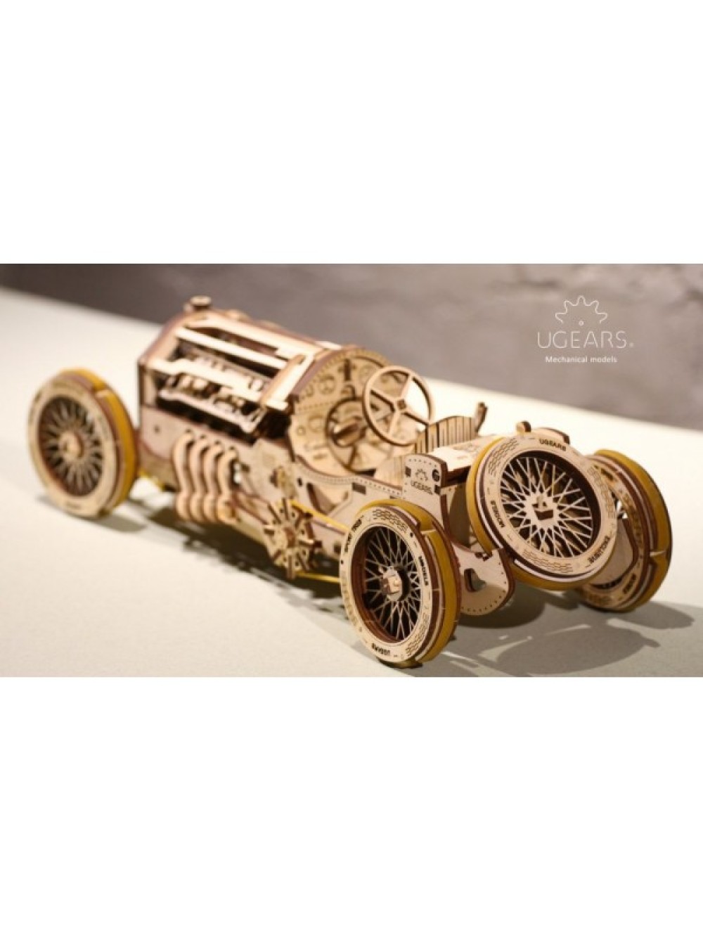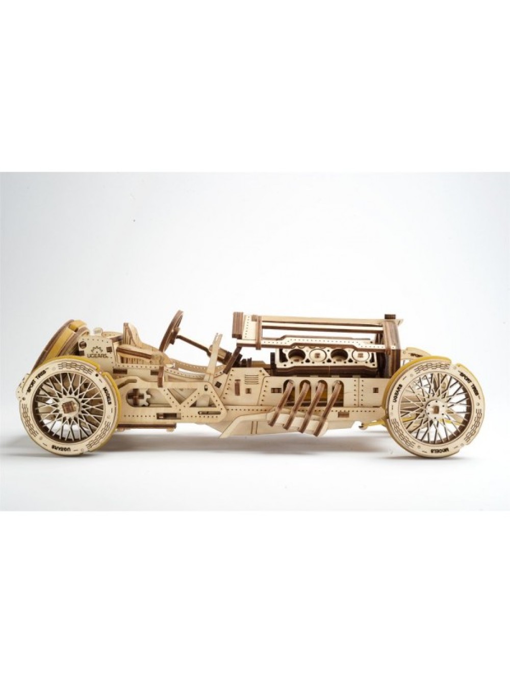 В спорткаре U-9 Гран-при UGEARS воссоздали классическую конструкцию и спортивный дизайн победителей ранних автогонок. Под капотом этого красавца Вы найдете 8-цилиндровый V-образный двигатель с 16-ю работающими клапанами и полноценным вентилятором. Гоночный автомобиль оборудован продольной рулевой рейкой и коробкой передач, переключающей режимы: «нейтральный», «назад» и «вперёд». Также в конструкции предусмотрены гоночные колёса с резиновыми покрышками, которые честно отрабатывают поверхность.