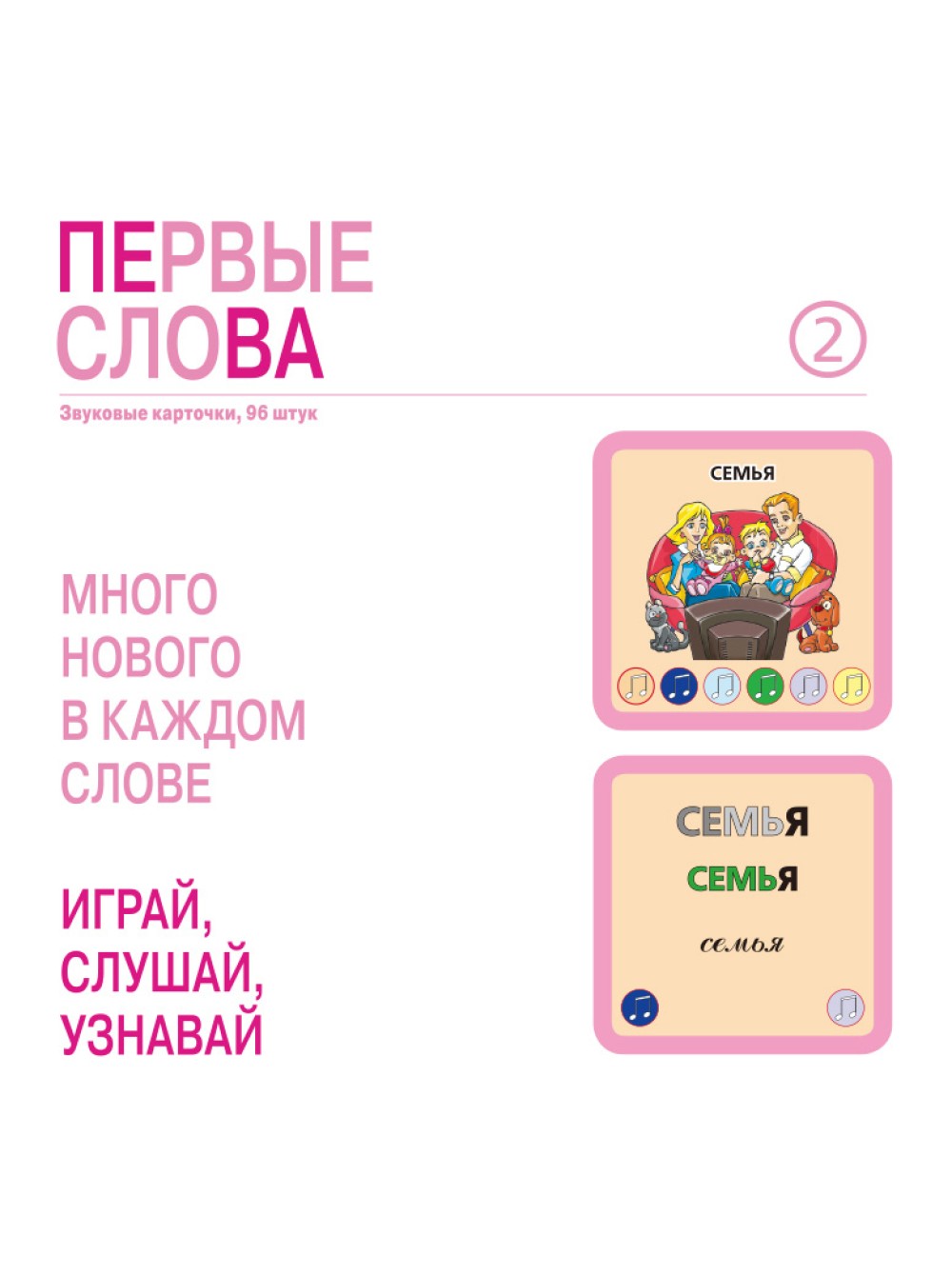 Изучая звуковые карточки из набора «Первые слова», малыш будет развивать память. На каждой карточке изображено определенное слово и картинка, а также графические символы.